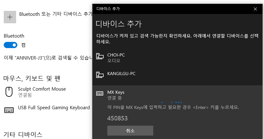 마우스의 경우는 블루투스 잡으면 바로 연결이 되는데 키보드는 특이하게도 한단계를 더 거쳐야된다.