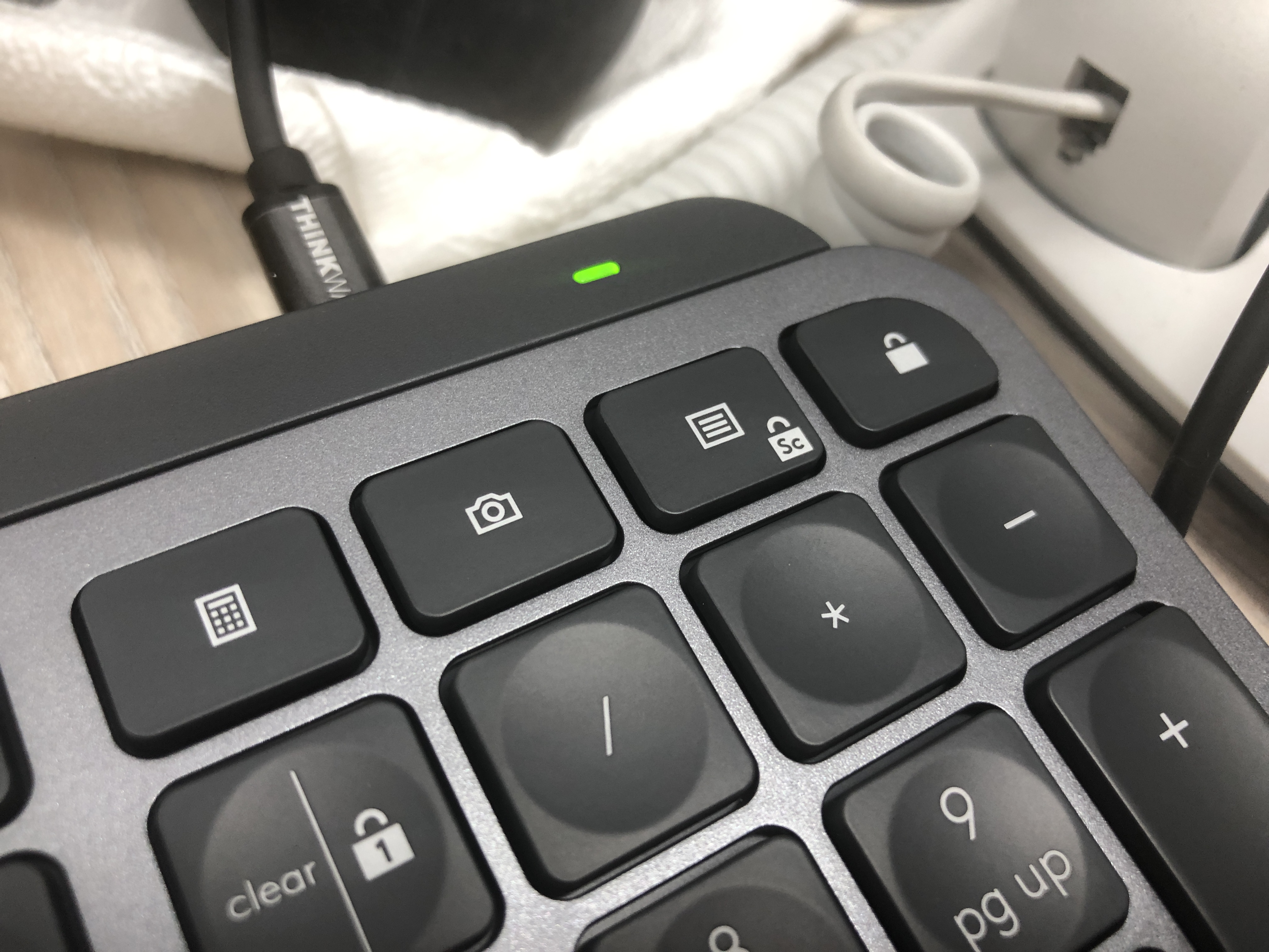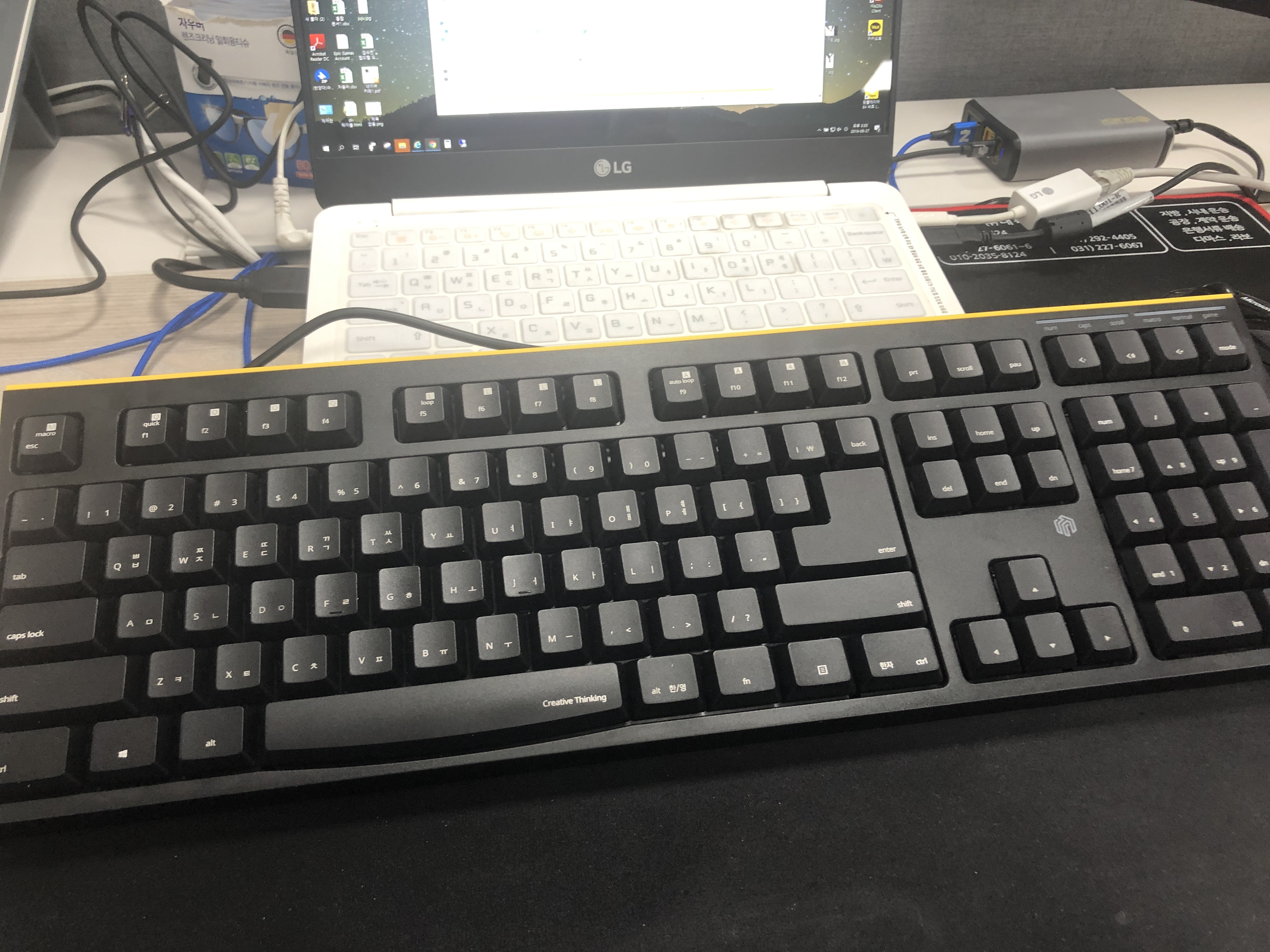 키보드의 경우 그 동안 내가 써온 환경이 저가 키보드만을 쓰다보니 키감이 쫀득쫀득하다는 글들을 보곤 한데 그런거 같다. 끈끈하다는 글을 봤으면 그렇게 느낄지도? 그리고 스페이스바가 조금 길다고 느낀다. 한/영 버튼을 누르는데 스페이스바를 누르곤 한다. 맥북의 키도 같이 각인되어 있다보니 키들이 긴편이다. 기능성 키보드가 처음이다 보니 스샷찍는 버튼도 찾기 힘들었다. 스샷찍는 키의 위치는 우측의 숫자패드 위에 카메라 아이콘이 있다.
