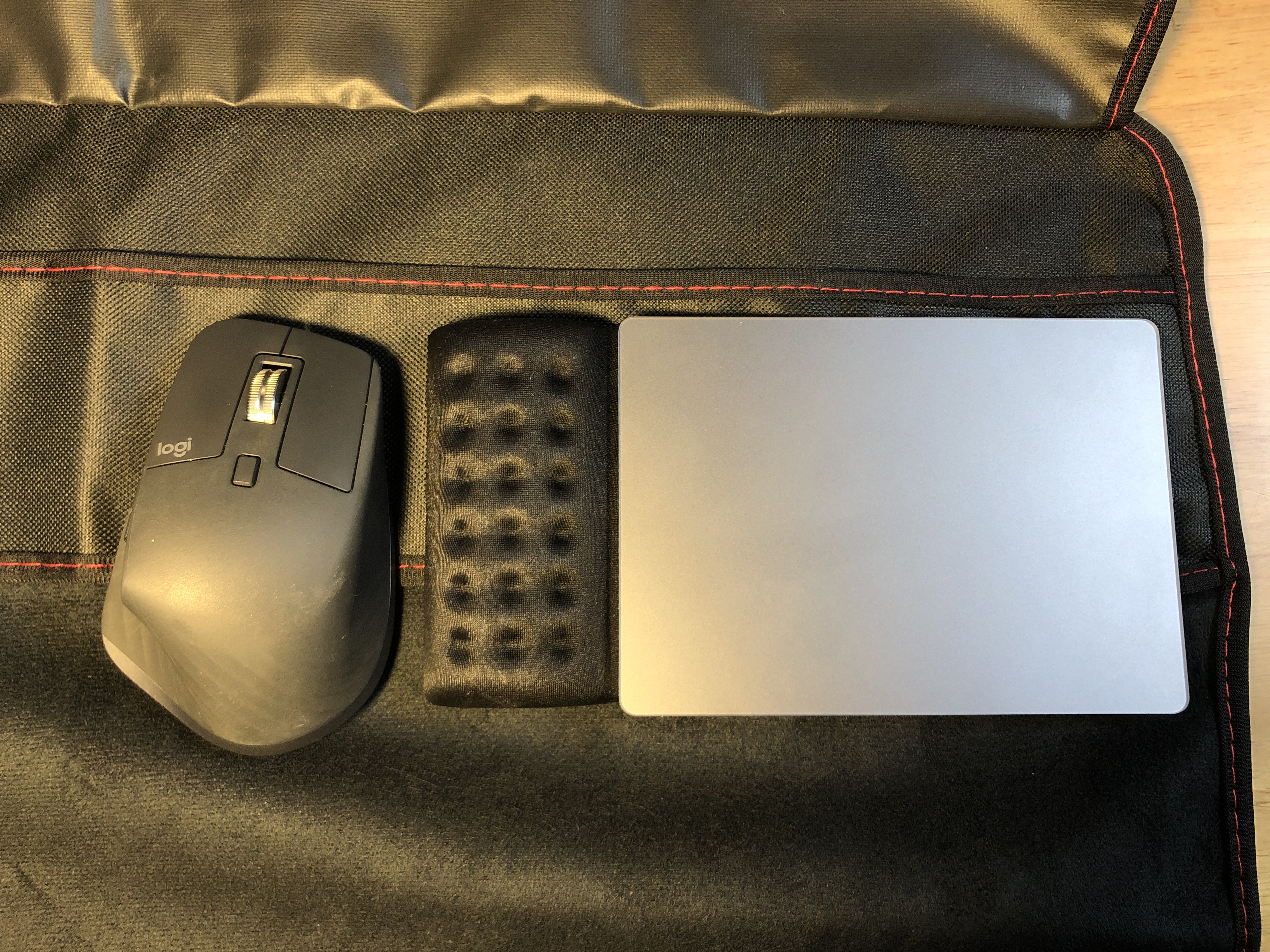 커버 뒷면에 매직트랙패드2, 손목받침대, 로지텍 MX MASTER3 마우스가 들어가고요.