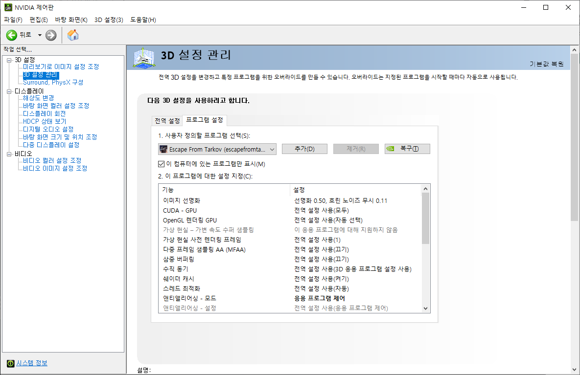 어두운곳에서는 NVIDA 설정 사용을 체크