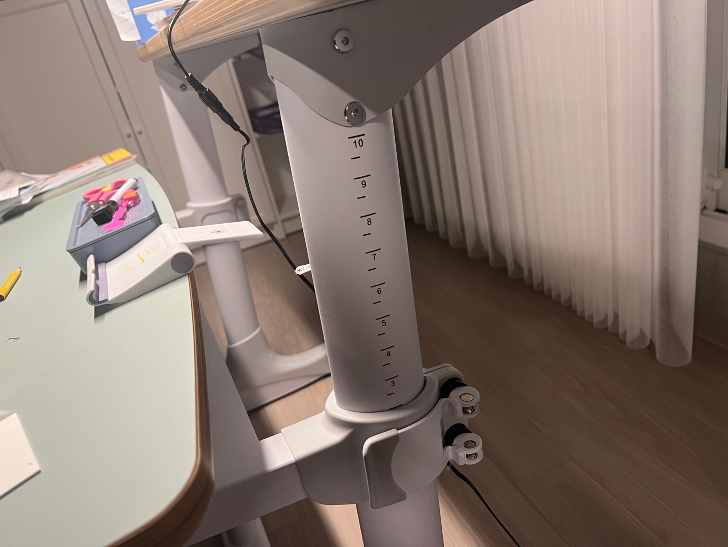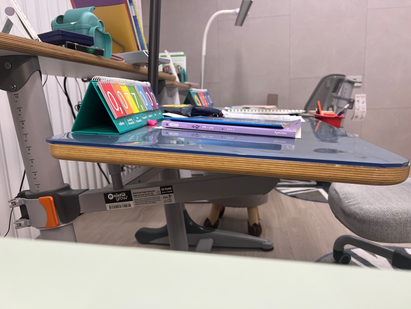 어릴적엔 책상에 안 앉았는데 커가면서 자연스럽게 본인들이 식탁보다 책상에 앉는게 편하다고 느끼는지 책상에 앉는 빈도는 확실하게 늘었다. 많은 부모님들이 각도조절 좋은데 부분적으로 각도 조절되는 책상보다는 전체적으로 되면 굴러다니지 않을까 싶으신데, 굴러가면 아이들도 불편하니 더 정리하지 않을까? 생각 됩니다.