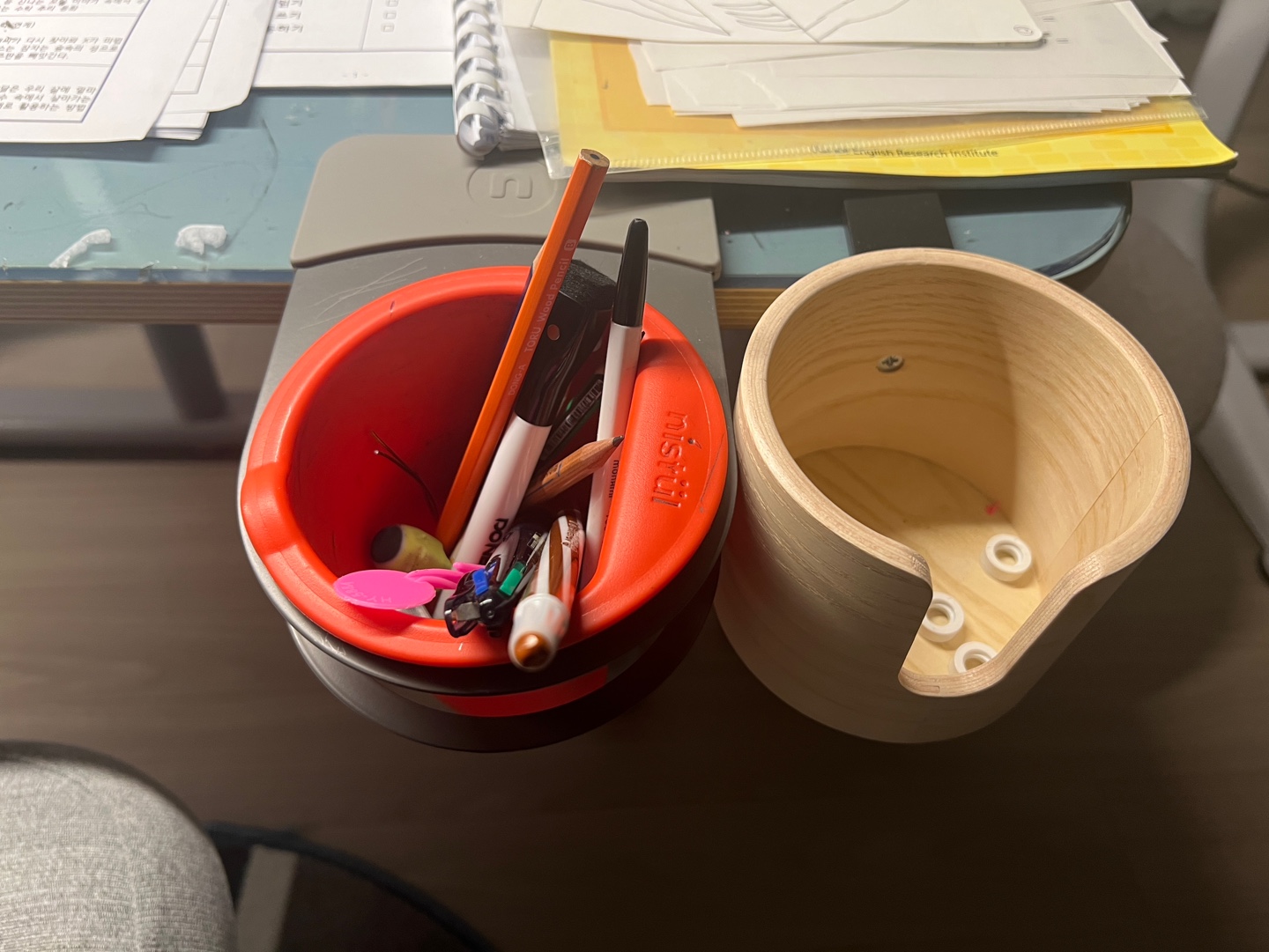 좌측이 펜홀더, 우측이 컵홀더 이다 컵의 손잡이 부분이 파여있어서 손잡이 컵도 놓고 쓸 수 있다. 펜홀더나 컵홀더가 있음 좋은점이 책상을 넓게 쓸 수 있고, 특히 책상의 각도가 3도 기울어져 있는데 혹여나 컵이 쓰러질때 물이 쏟아질것을 방지 할 수 있을걸로 생각된다. 지금은 역시나 본인들 물품 보관함으로 사용되고있다.