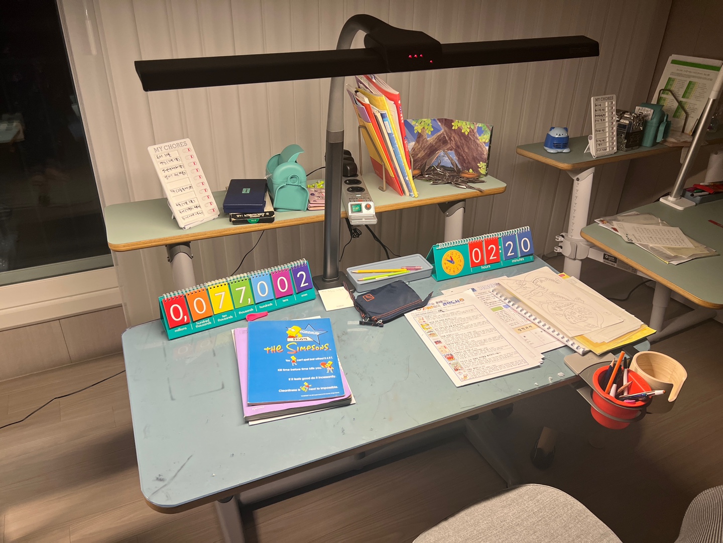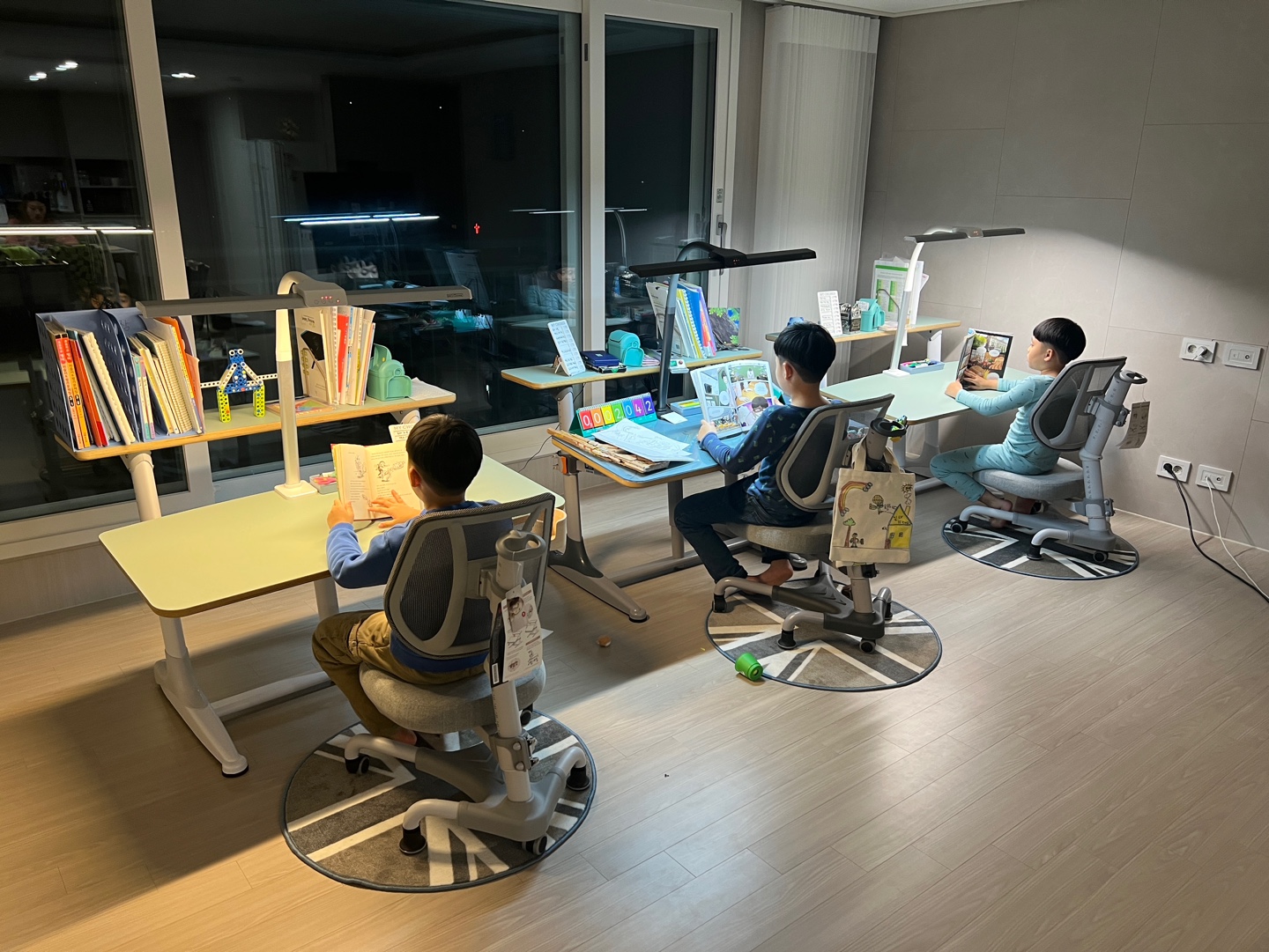스탠드는 예전에 구매한 브로드윙 제품으로 조립을 했다. 아이들이 원하는 조명으로 책을 읽거나 공부를 한다.