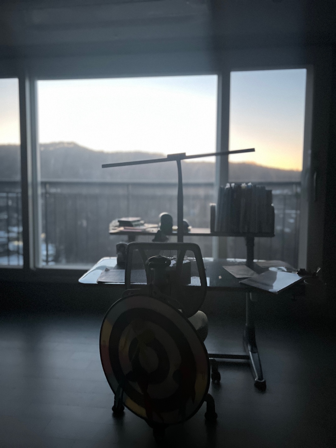 아침에 출근길에 책상과 바깥풍경이 운치가 있어서 갑작스레 사진을 찍어보았다.
