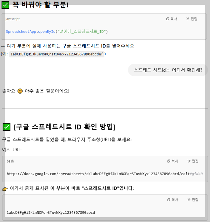 사실 이 부분은 현실적으로 피하기 어려운 부분입니다. 특히 ChatGPT와 함께 만들다 보면 계속 테스트하고 수정하면서 Apps Script도 자주 배포하게 되는데, 그때마다 URL이 새로 생기기 때문에 이 작업은 반복될 수밖에 없습니다. 그래서 이런 시스템을 도입하려는 분들은 어느 정도 이 과정을 감수해야 한다는 점도 미리 알고 계시면 좋을 것 같습니다.