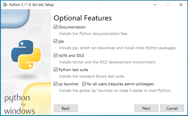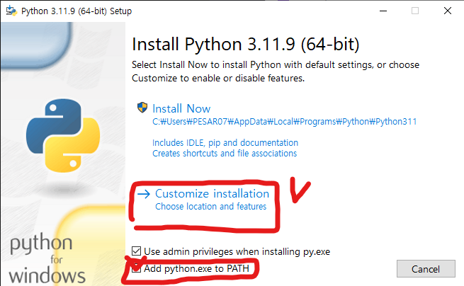 - 설치 위치 변경 가능: 예) C:\Python 혹은 내문서\Python