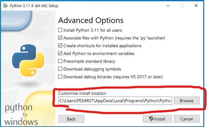 - 설치 위치 변경 가능: 예) C:\Python 혹은 내문서\Python