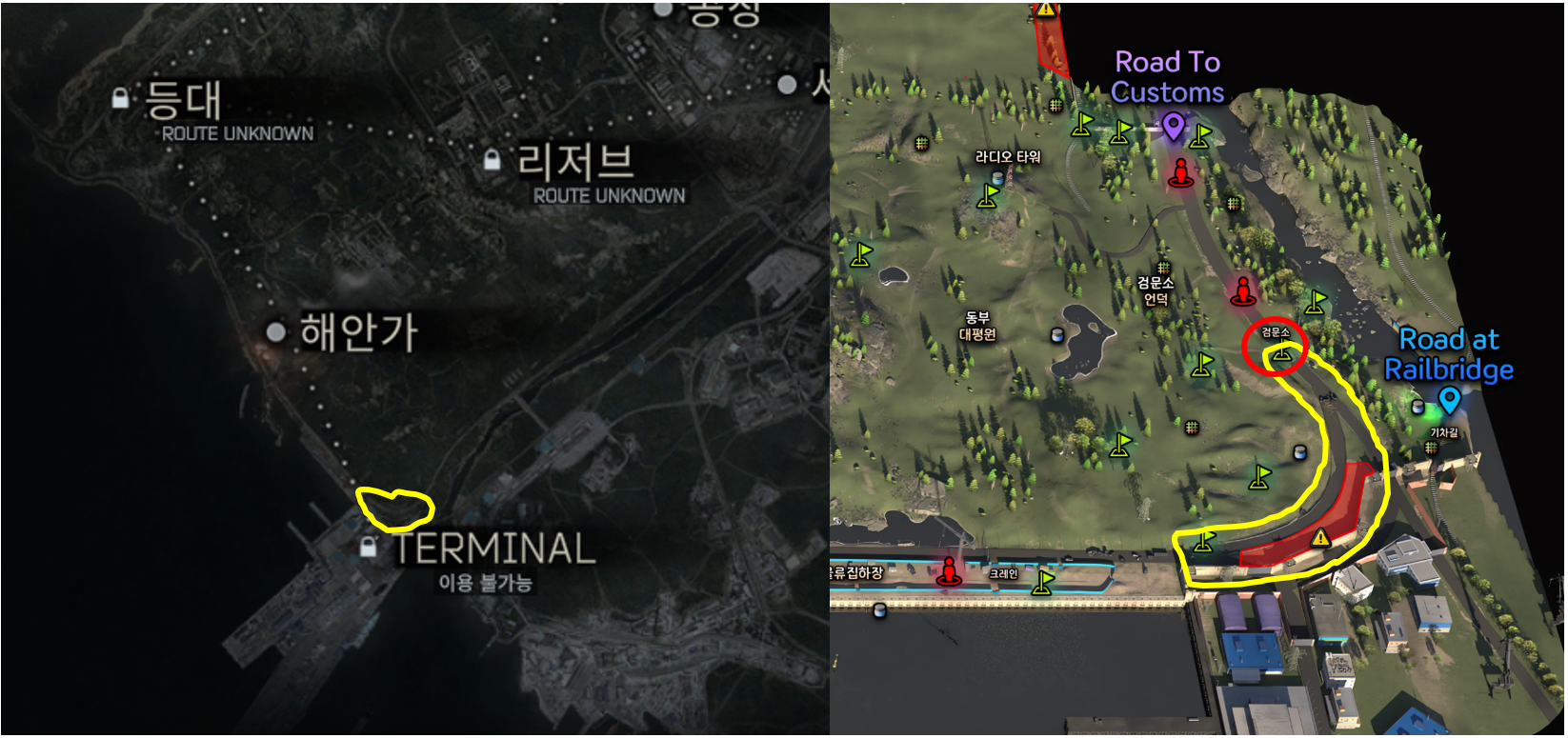 노랑색 구역 : 타르코프 정식출시이전에는 진입이 가능했지만 현재는 불가합니다. 들어가면 저격으로 죽는다고 합니다.