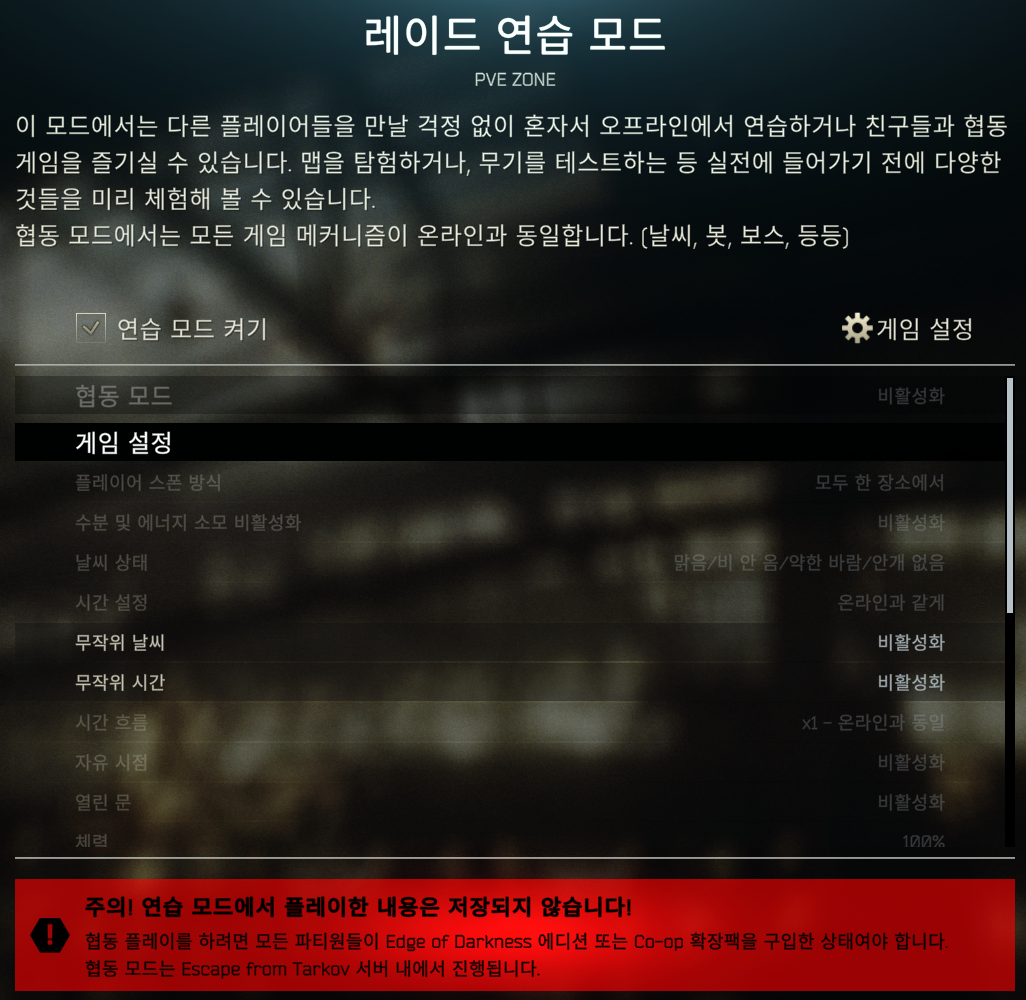탐험할 맵을 선택 후 다음다음 누르다 보면 아래와 같이 나옵니다. "연습 모드 켜기"를 체크해주시면 됩니다.