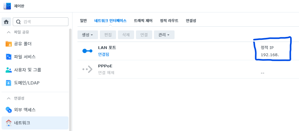 제어판 - 네트워크 가시면 LAN포트에 나스의 IP가 적혀있습니다.