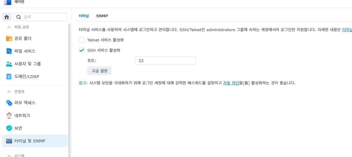 먼저 시놀로지 에서 "SSH를 활성화 합니다.