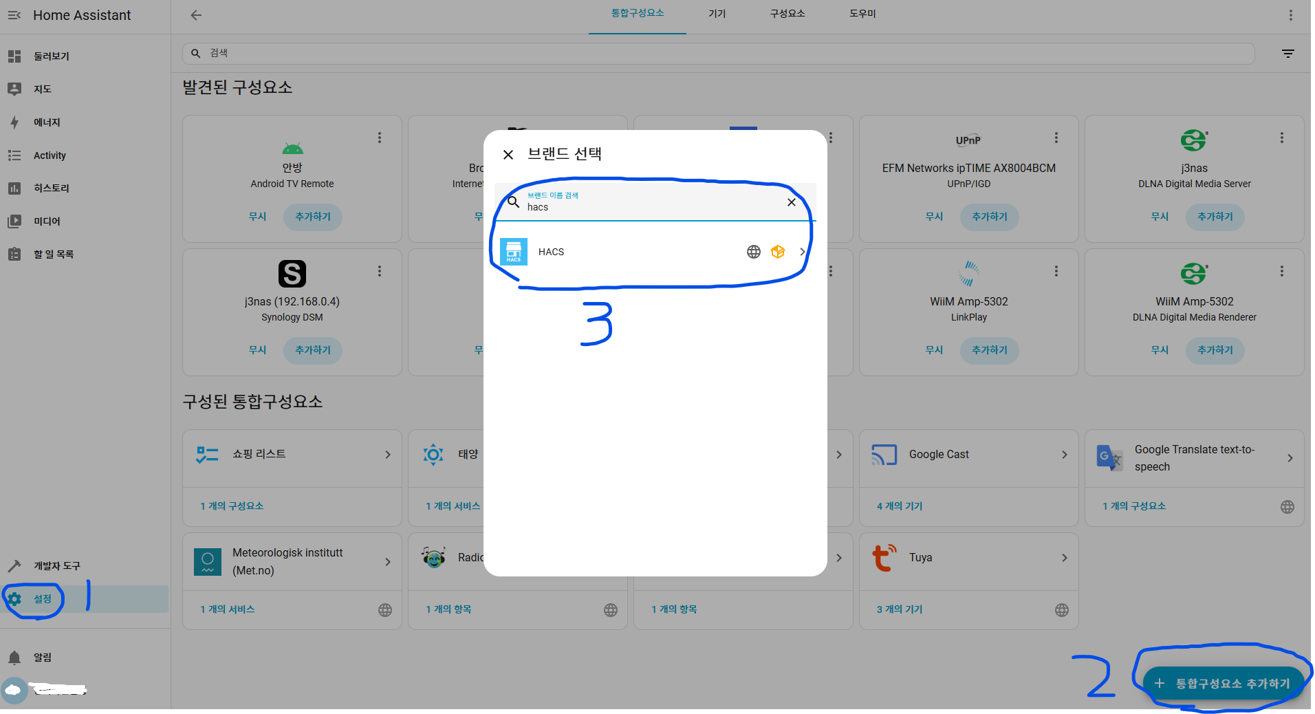 설정-통합구성요소 추가하기-hacs검색하면 이제는 검색이 된다. 3번을 선택하면 설치가 시작된다.
