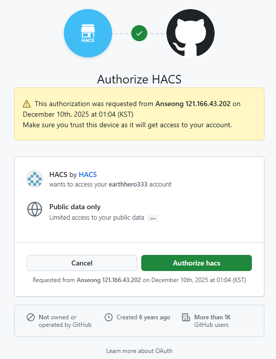 이 화면은 “HACS가 네 GitHub 계정의 공개 정보에 접근해도 될까?”를 마지막으로 묻는 확인 창이다.