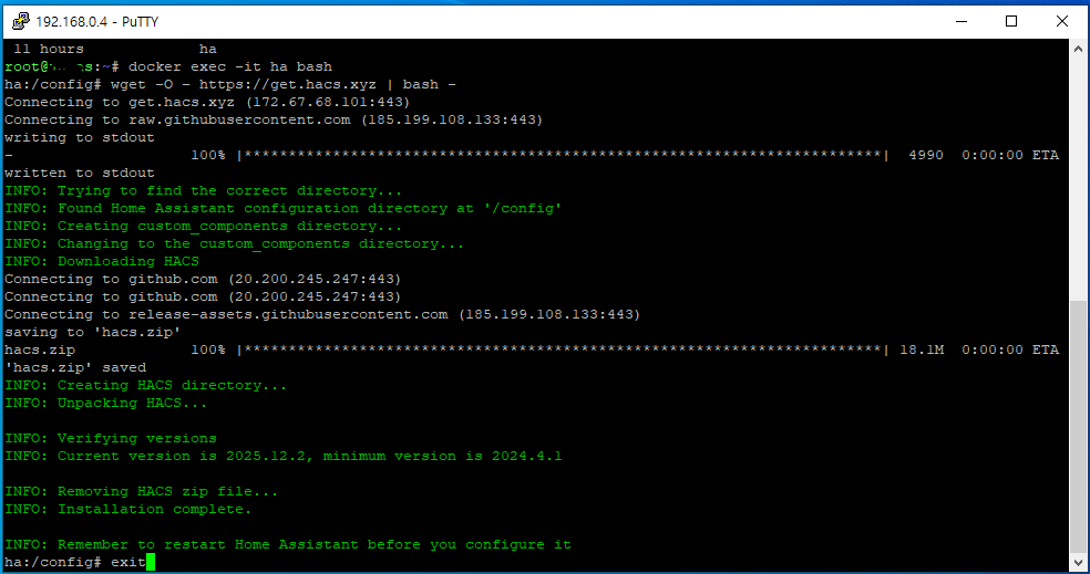 "wget -O - https://get.hacs.xyz | bash -" 작성하면 뭔가 주르륵 설치가 된다 다 되면 exit로 탈출하면된다