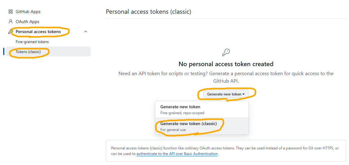 Personal access tokens - Tokens (classic) → Generate new token - Generate new token (classic) 선택하고