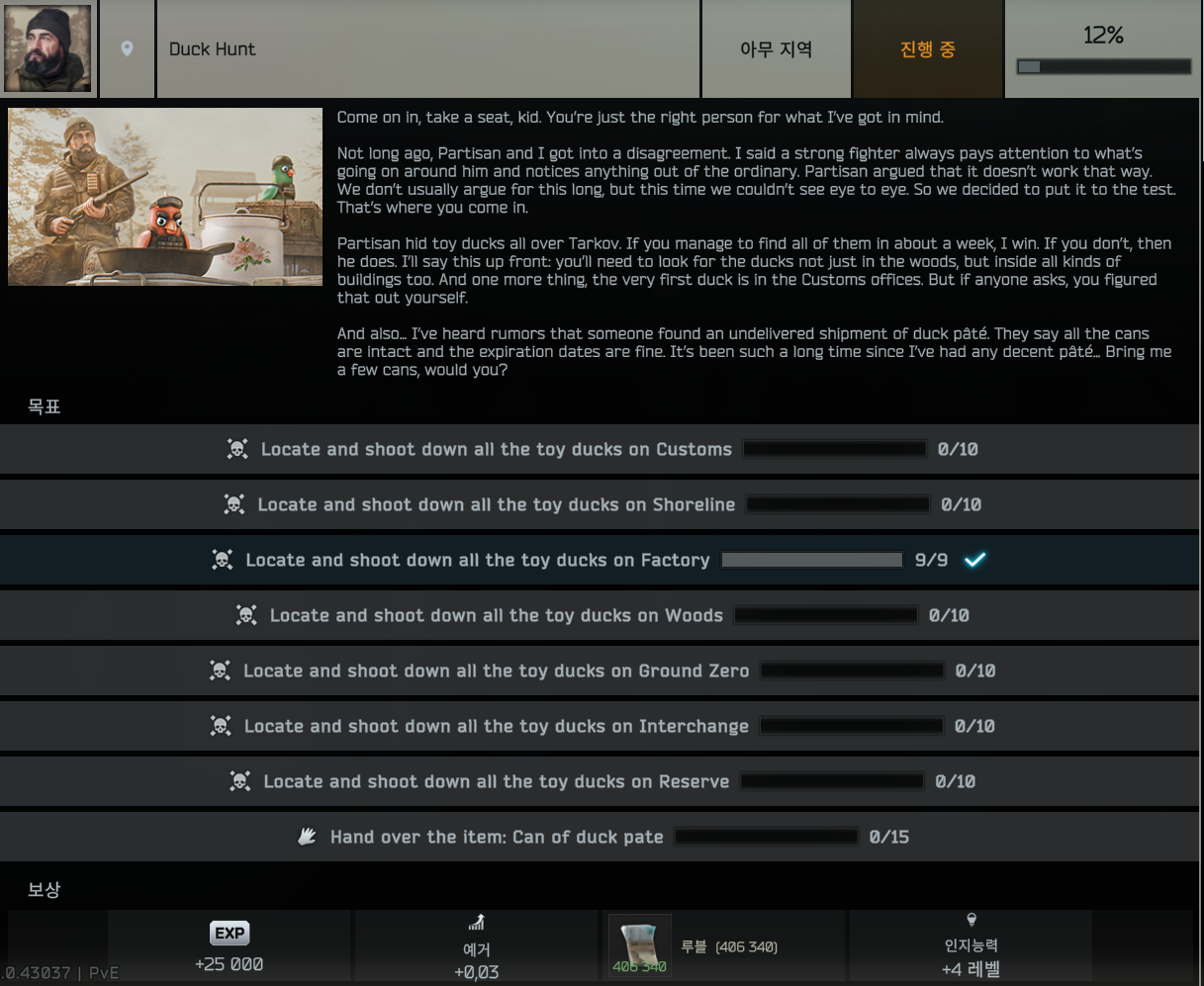 7개의 맵에 산재해 있는 오리 장난감을 쏘세요. 그리고 "duck pate" 통조림 15개를 납품하시요